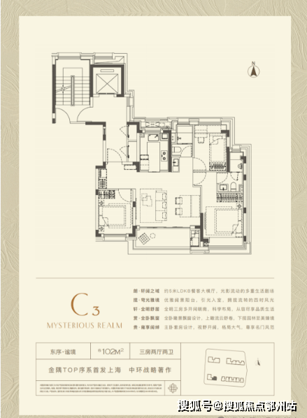约102㎡的全明户型,三房两厅两卫格局 ,设计同样巧妙。