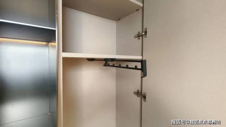 室内确实还做了一些很好用的小细节,比如入户玄关柜,在可见的 定制皮革硬包加透光云石,以及 实木贴皮墙板造型之外,还给右侧预留了一个 足够宽的柜体,以及一个专门用来挂外套 大衣的伸缩衣架