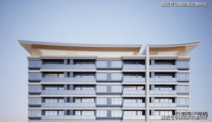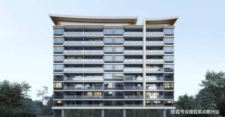 浅香槟金、香槟金铝板交叠,搭配深、浅灰涂料,打造出精致富有层次的立面。最吸睛的是 顶部的新中式飞檐,两端微微起翘,勾勒出灵动的天际线,将来远远望去一眼即可识别。