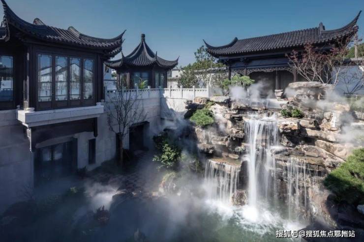 步入与山门之后,映入眼帘的是一座下沉式庭院,庭院下沉,原本平底阁楼,如今显得高耸入云。中有瀑布倾泻而下,其势有凌空之意,令观者顿生“江流天地外”的美感,叠石理水,亦有“山色有中无”的意境。