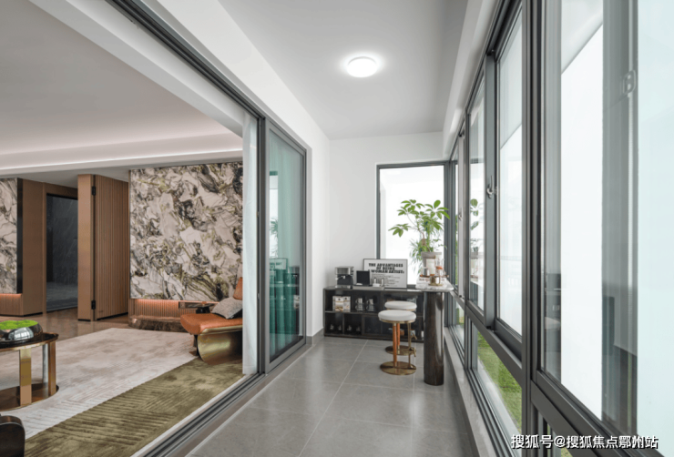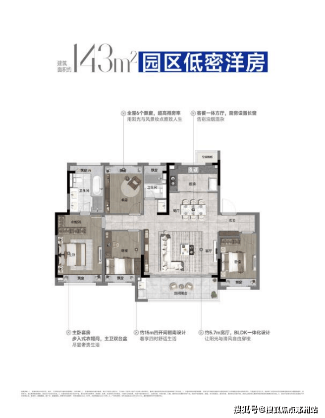 餐厅、客厅联动超阔尺度阳台,无形中将家的采光面与风景线延伸至外,私密尊崇主卧套房,双台盆设计、超大飘窗,
