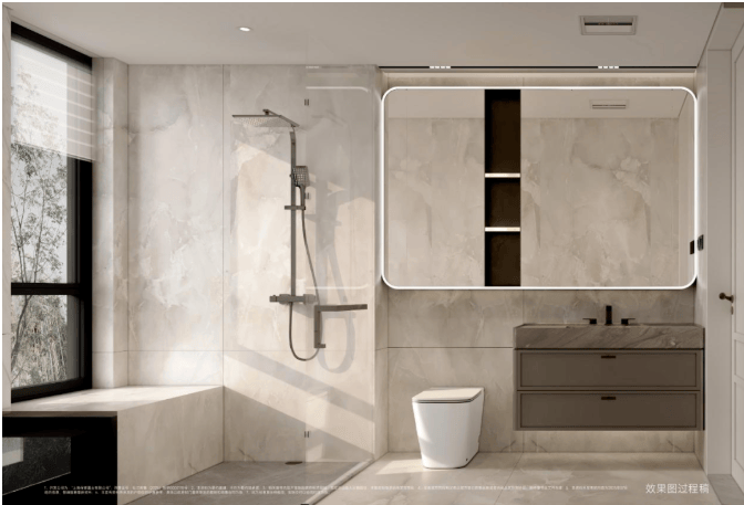 配备美妆龙头,大容量镜柜可收纳洗漱用品,利用墙面空间设置壁龛,便于存放毛巾、衣物便于取用。