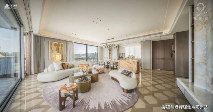 该套户型以“湖风雅颂”为主题,一楼客厅背景墙采用海纳百川奢石结合液态金属漆的手法,绘就弧形海浪造型,进门就以奢华开场呼应湘湖山水,客厅卡里冰玉大理石拼花地面,为家注解温柔细腻的气质;