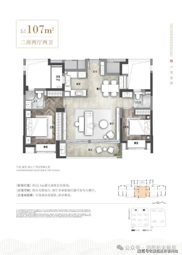 私人定制:三房/两房自由切换,12.5米南向四开间或5.7米奢阔横厅,满足三代同堂与养老需求;