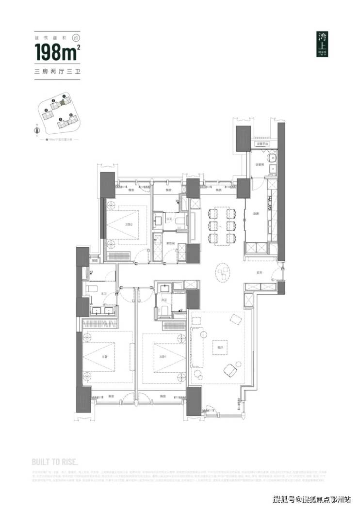 主推建面约 150 - 256㎡纯粹大平层,三梯三户,层高 3.3 米,空间开阔大气。