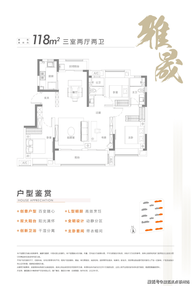 百变大横厅设计,同等面积多一房,三房价格住四房,3开间朝南,通风、采光、览景俱佳。南北双阳台,景观生活两不误。L型明厨设计,空间宽敞明亮,动线流畅。主卧套房设计,配备衣帽间与卫浴间,私密性强,乐享尊崇人生。