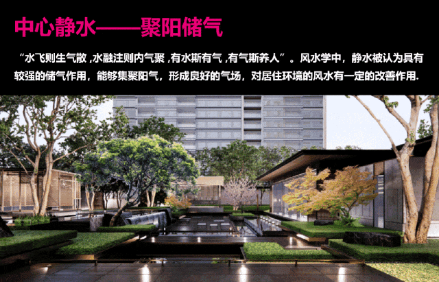贯穿入口、庭院、仪式归家轴线和超级引力中心,使用静水、跌水、点状涌泉、立面叠瀑、弧形流水五重造水形态,再现中式王府名园的格调和风雅,为业主提供多姿多彩的社交生活。