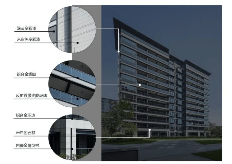 整个外立面材质以多彩漆为主,辅以金属线条压边。低层基座采用浅米色的石材,特别在入户大堂部分增加少量金属铝板加强整体品质感。