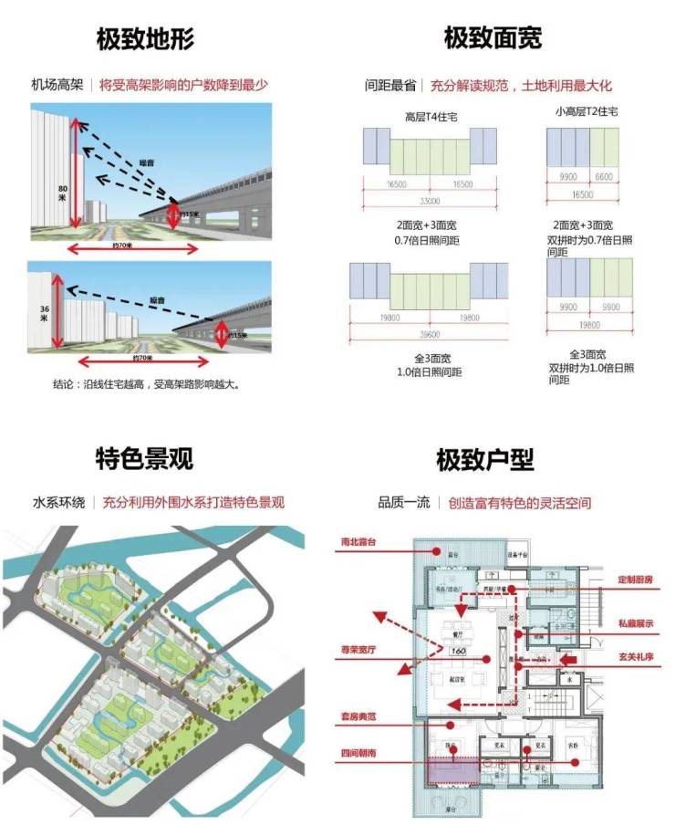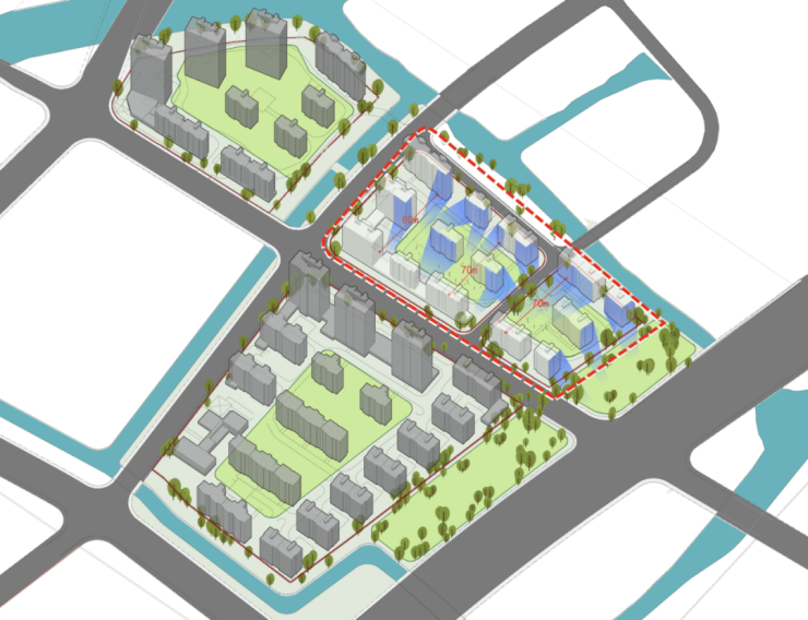 天悦二期由两个小地块组成,容积率2.0。面对这样的中高容积率,仅有3幢40米左右的高层,其余均为11层的洋房。设计从单体户型入手,合理利用当地规范与地块地形,从高度到间距、从平面到立面、从公区到户型,极致的设计成功打造了高容积率下低密洋房社区。