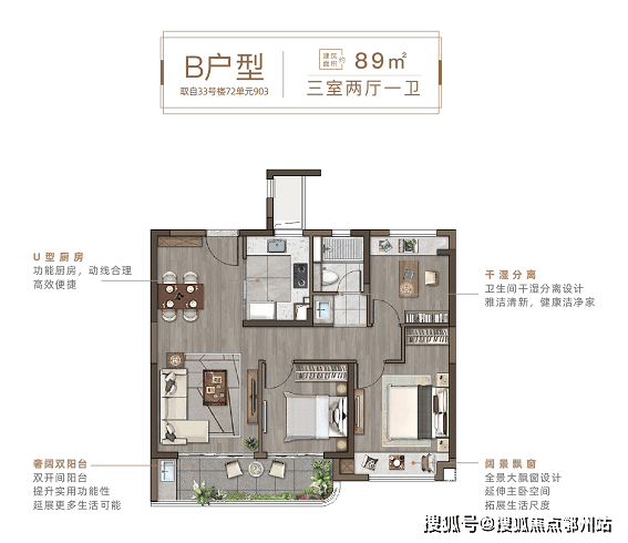 高窗地比设计:较高的窗地比设计,呈现出空间视野以及才采光面积的最大化,赋予了居住空间 更多衍生的想象与价值。