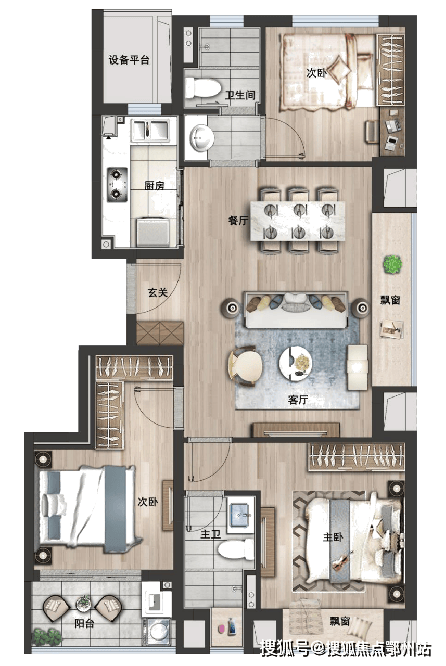 主卧套房,次卧带阳台,全明双卫。