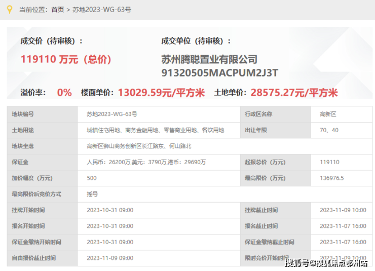 上润璟庭,即,苏地2023-WG-63号地块,位于高新区狮山商务创新区长江路东、何山路北,是2023年11月9日,腾聪置业以底价119110万元竞得,成交楼面价13030元/平。