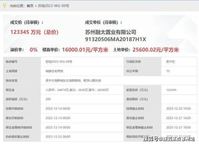 项目用地是苏地2023-WG-99号地块,去年12月23日,金融街以底价123345万元竞得,成交楼面价16000元/㎡。