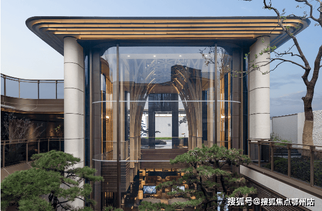 二进序厅:以水、风雨连廊、空中悬挑平台串联山水相依风雅景致 , 呈现三层立体园林及约 15 米飞石叠瀑景观。;