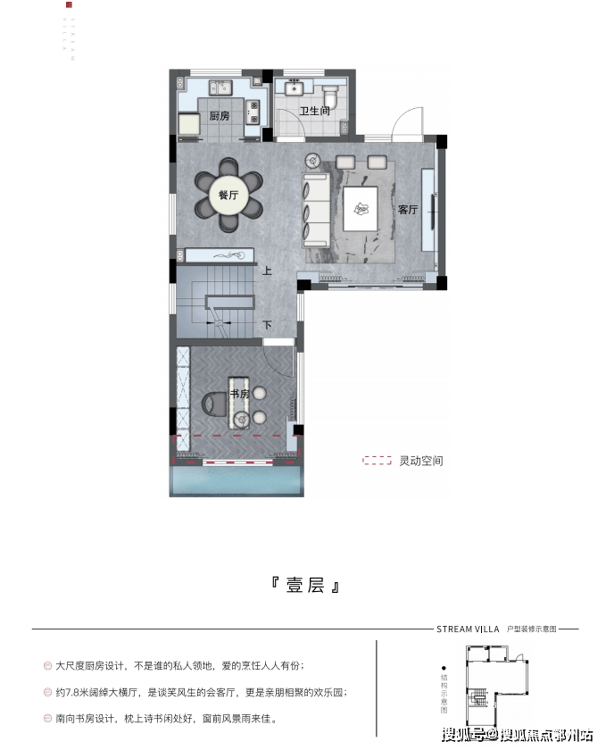 一层约7.8米的大横厅 ,尺度阔绰,场景气派,可以是谈笑风生的会客厅,也可以是亲朋相聚的欢乐园。