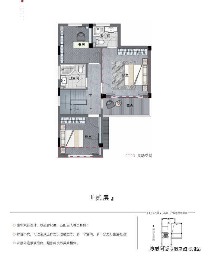 二层3房设计 ,满足多口之间的居住需求,也可根据情况改造客房、书房、儿童游戏室、琴室等空能空间。