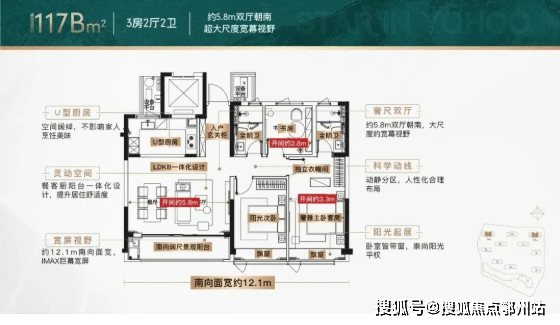 譬如,建面约115方三房两厅两卫,以三开间朝南搭配LDKB一体化阔厅,通过约27方餐客厅与观景阳台无缝串联,尺度彰显气势之外,与公区融合后,衍生出更多社交价值。