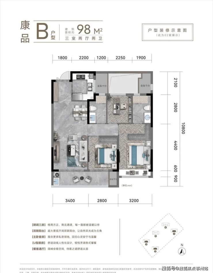 建面约98-104㎡方正三房,南向双联阳台