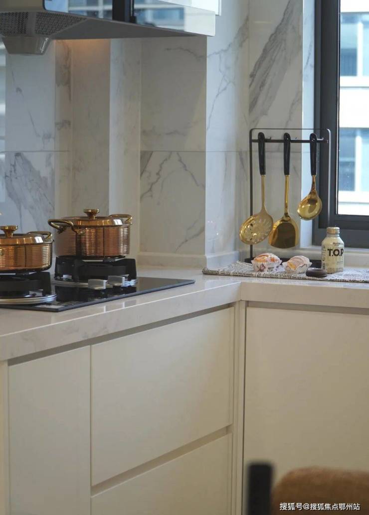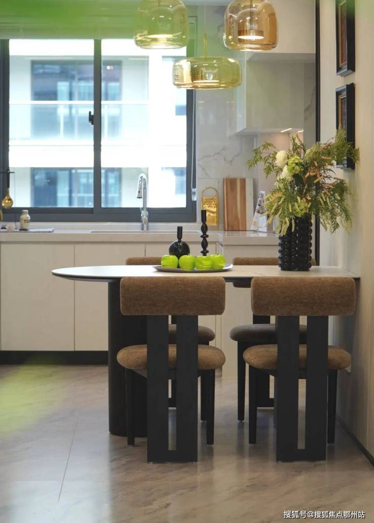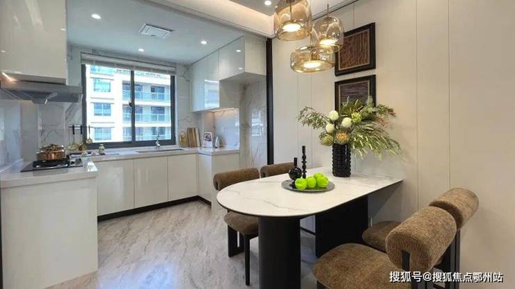 厨房采用经典布局,洗切炒动线流畅, U型操作台与餐厅既相互融合又功能分区明确,对于喜欢爆炒的家庭而言,这里也可以很好规划一扇玻璃移门,隔绝油烟与噪音。餐厅标配四人餐桌,同时宽敞的空间也为会客聚餐预留了足够的延伸空间。