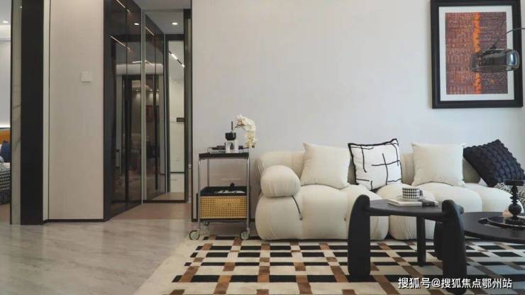 推开样板房的大门,通透、宽敞是对空间的第一印象,现代简约风格装修,简单却不失高级感。客厅通铺大理石地砖,搭配云朵造型奶白色沙发以及撞色系茶几,阳光透过落地窗洒入室内,整个空间干净明亮,尽显优雅格调。