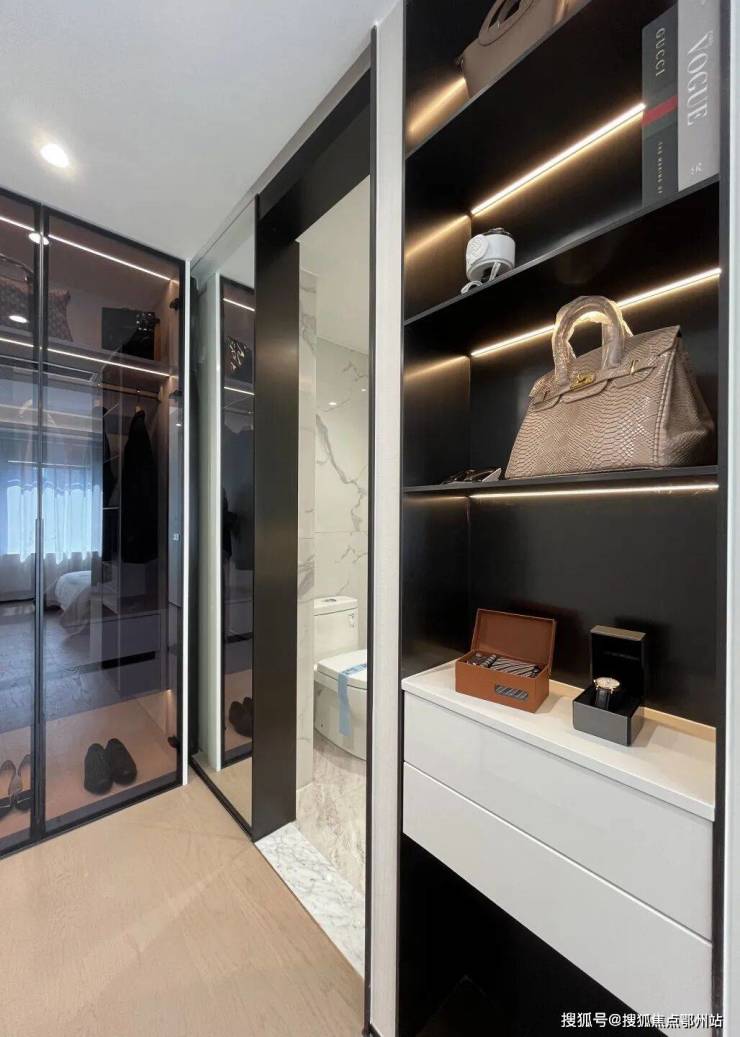 主卧舒适套房空间标配独立卫浴,明窗设计,采光通风优越;定制多区间通顶衣柜,分区收纳衣物、包包、配饰等,堪比「私人衣帽间」。