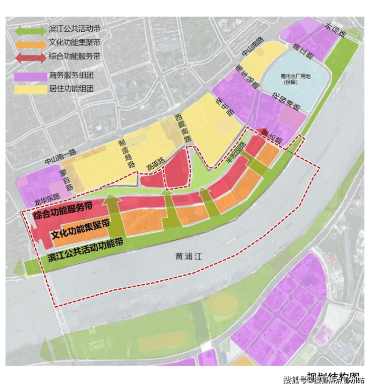其中,明确提出形成三条平行岸线的功能带:一是滨江公共活动功能带,延续滨江贯通需求,增加游憩、休闲、展示和运动等配套设施,集聚最活跃的公共活动功能;