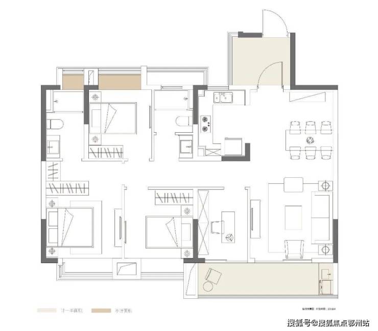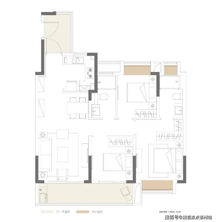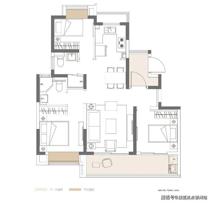 103㎡三室两厅两卫王炸户型关键词:约10米开间尺度、约6.6米阔绰观景阳台、U型厨房合理规划、主卧套房设计。