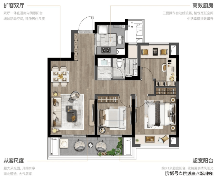 在户型设计方面,远洋正荣玺樾从业主需求出发, 扩大采光面,最大程度带来大面宽和浅进深。即使是 89㎡小户型,也做了三房,还实现了双阳台设计。