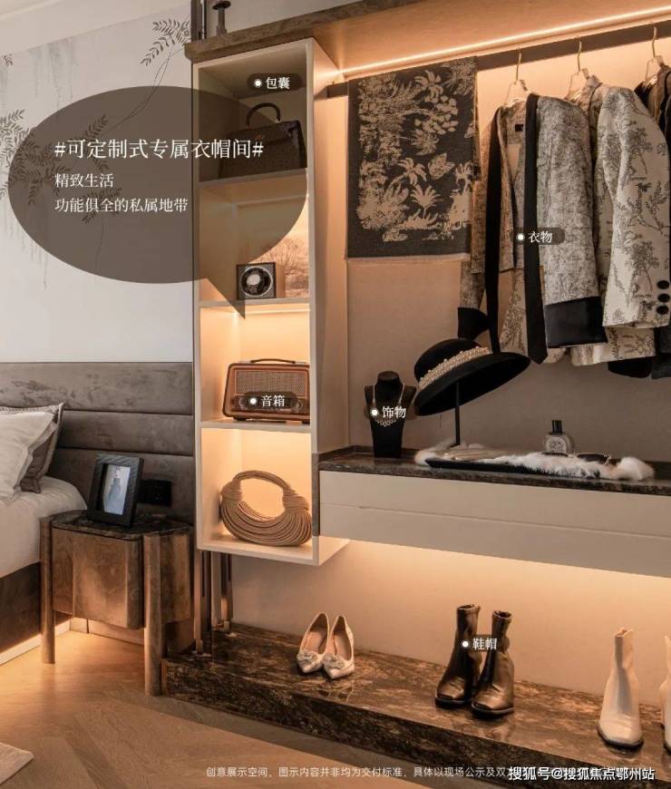 在样板间设计中,主卧精心打造了L型衣帽间,避免床榻直面内卫,同时进一步增加套间内的宽敞与通透,也使收纳空间更为规整。在装修时,您可以充分借鉴这一设计灵感,根据个人喜好和需求,对衣帽间进行个性化定制,打造属于您的专属收纳空间。