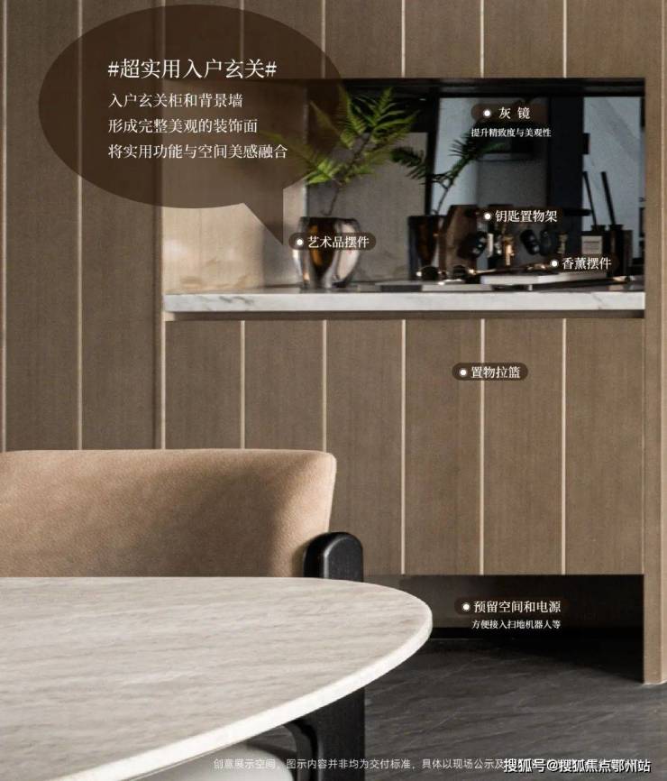 入户区域精心规划,预留宽敞空间,便于您根据个人喜好和需求设置玄关柜。您可以选择融入S墙与灰镜元素,以打造简洁而统一的视觉美感。同时,玄关下方可预留空间和电源接口,为未来安装扫地机器人等智能家居设备提供便利。