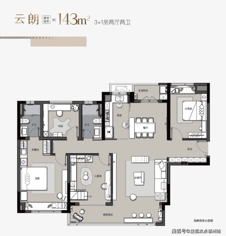 【🏙 143m²高层户型鉴赏】LDK生活厅,南北通透7.4米宽阔阳台,4卧室面宽超3米高空间赠送,宽境景观阳台