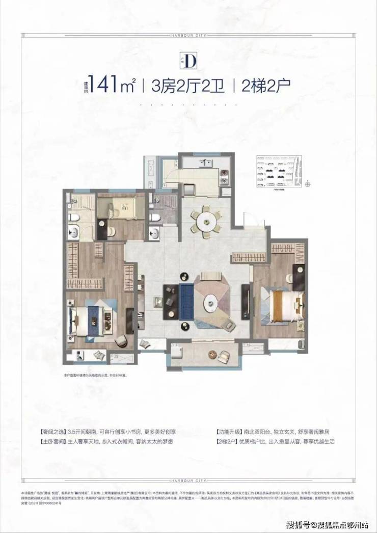 建面约141㎡3房2厅2卫户型,做到了3+1开间朝南+主卧套房设计+南北双阳台+南北通透+卫生间干湿分离,2梯2户设计加上独立玄关,出入皆尊荣。