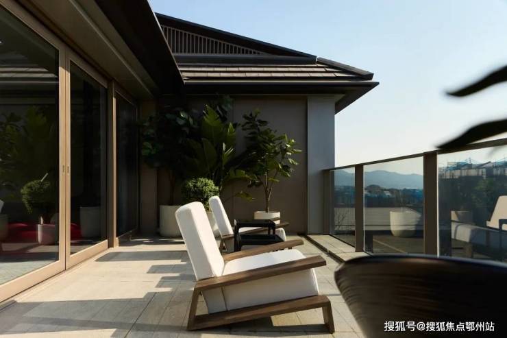 建筑坡顶采用大坡顶与小坡顶结合,屋面采用瓦片材质与金属钩边进行铺装,青瓦交叠,如远山淡墨。立面局部采用仿石铝板进行装点,在檐下空间与建筑装饰上,点缀了橡木灰金属材质,形成克制且奢华的冲突美。