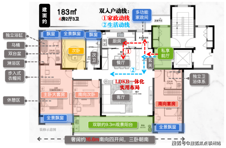 建面约183㎡户型一大亮点, 就是LDKB一体化设计,厨房+餐厅+客厅+阳台面积超过72㎡,公区家庭互动区面积相当于他人整个家,十分气派!