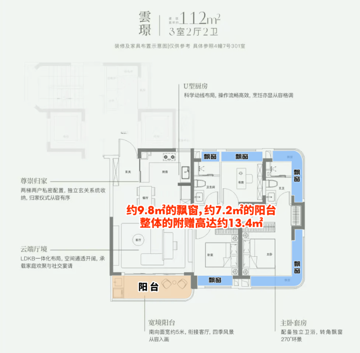 这个户型有约9.8㎡的飘窗,约7.2㎡的阳台,整体的附赠高达约13.4㎡。 这是目前上海外环沿线,是附赠率最高的一个小高层产品。