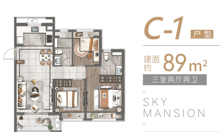 建面约89㎡(三房两厅两卫)