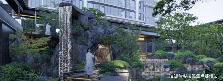 项目的下沉庭院,取意于古汉阳十景,如诗如画,庭院池底是凤凰图腾,楚文化展示长廊、揽月雕塑,延续云梦古泽、高山流水的意境,打造一番山水小天地;样板间的中央空调出风口与室内门面,均采用定制的蛟龙纹。