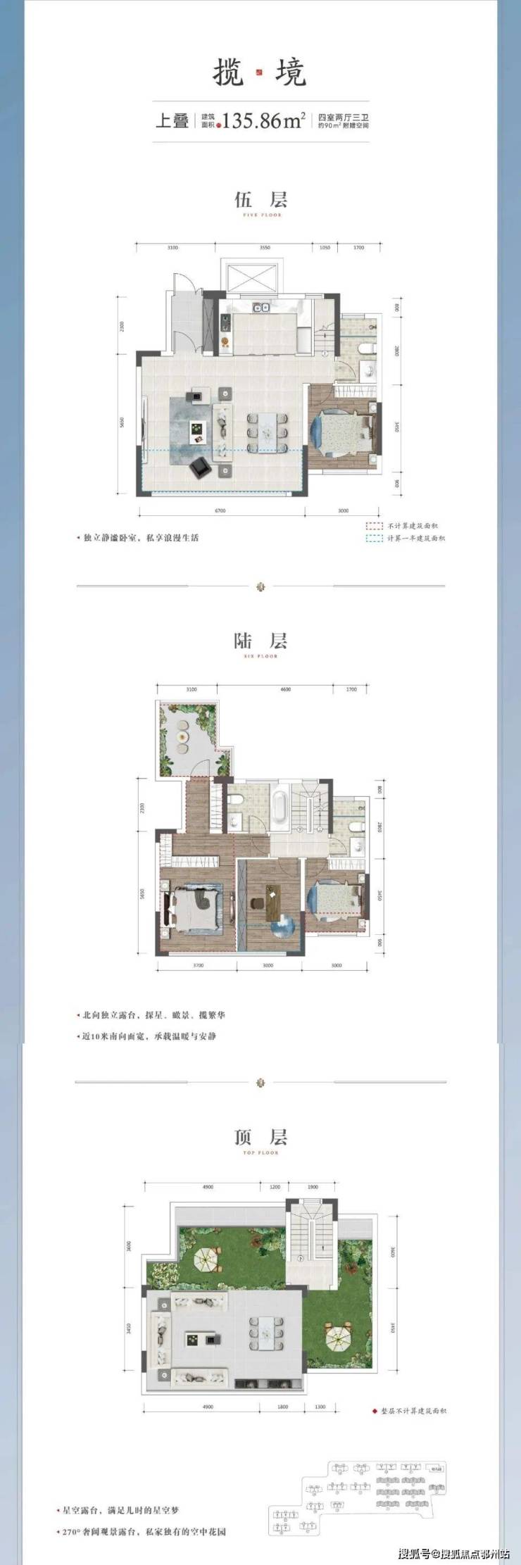 叠墅:总高6F,分上叠、中叠、下叠,一梯两户,建面约135-142㎡