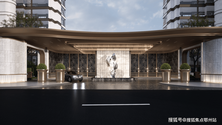 挑高金属雨棚采用极细边,中间凿壁采用透光奢石,搭配极具现代主义的雕塑彰显小区档次,背景墙面采用维多利亚黑大理石,奢华且低调。