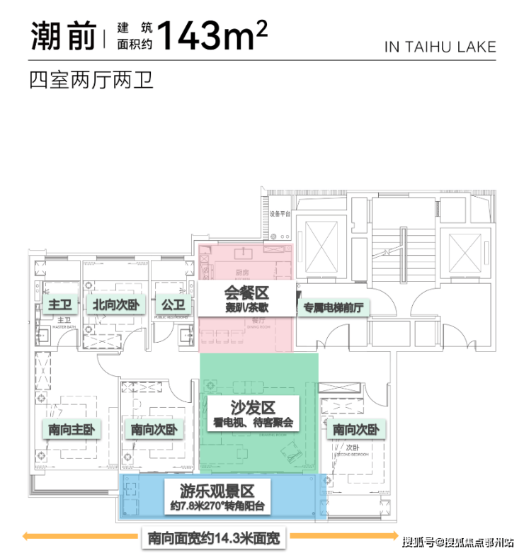 南向面宽可达 约14.3米 ,四开间一体朝南敞开, 1厅3卧直面阳光, 采光性和通透度都非常优越。