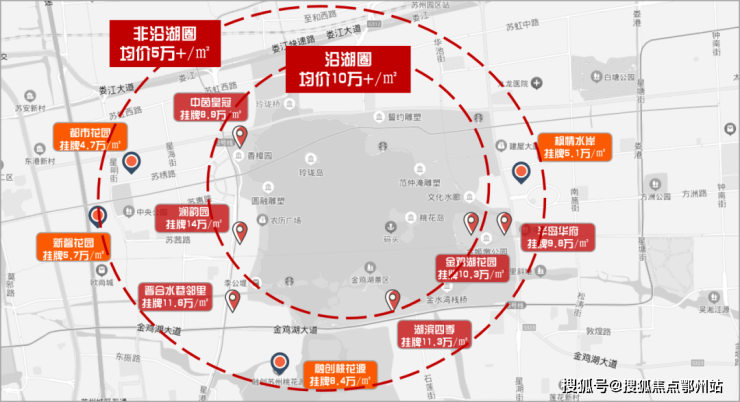 这在苏州也是共识,一线临湖始终是片区房价峰值所在, 离湖距离不同,也决定了其价值的高低。