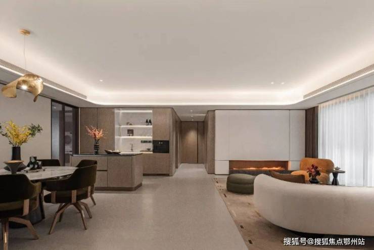 而且项目尺度虽阔仍对面积极致利用,客餐厅一体化的设计造就了全市豪宅领域鲜有对手的超大公区,客厅面积约60㎡,餐厅区一侧轻松放下多人大圆桌,足以盛放各类家族、亲朋聚会。