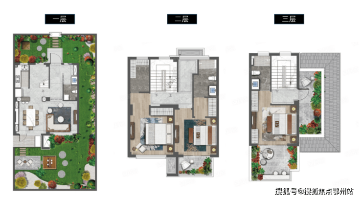 (4)整个户型有两个套间,二层套间连接阳台,三层套间有一个露台和阳台;