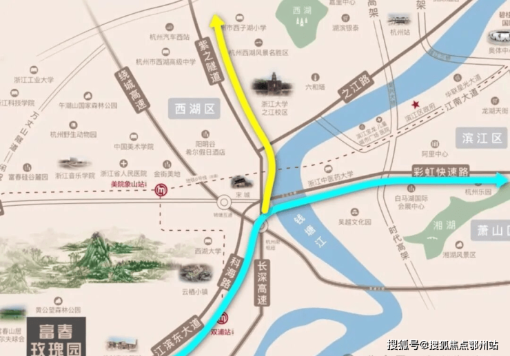 江滨大道、彩虹快速路西延段、铜鉴湖大道、紫之隧道等交通动脉,临近东洲岛高速口和杭黄高铁站,半小时即可辐射全杭城。