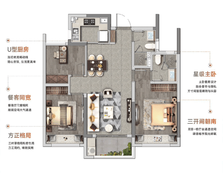 更得益于高超的空间设计,做到三房两厅两卫,更可灵活改造为“伪双卧套房”。