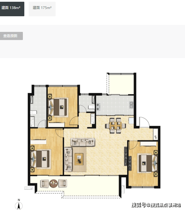 主力户型包括138㎡(3室2厅2卫)、175㎡(4室2厅3卫)、168㎡(5室2厅3卫)、226㎡(5室2厅5卫)等,均为南朝向设计,注重采光与通风