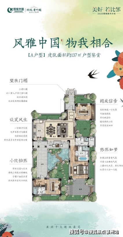 绿城青竹园【雲栖桃源】约137㎡合院多重庭院围绕建筑展开,使整个合院犹如在美景中生成。庭院从功能、形态、空间三方面出发,将居住伦理、亲情观点融入院落语言,将东方居住追求的内敛性、私密性与西方注重的空间开放性、功能性规划相结合,以庭院为核心空间,切合传统家庭大宅的营造法则,让庭院与建筑相融,与生活相融,营造出庭院深深的传统意境和现代生活特点。