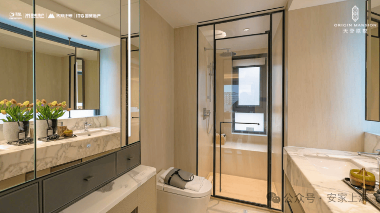 不光是品牌,选材上更是出彩。选用整块大尺寸玻璃+“三玻两腔”门窗系统,厨房采用大块马可波罗岩板,诸如此类的细节比比皆是。