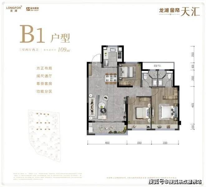建面约109㎡的三室两厅两卫边套户型,拥有约4.8米面宽的客厅