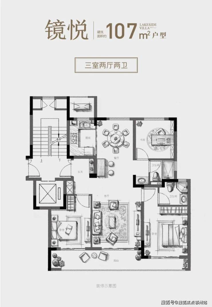 “镜悦”户型,建筑面积107㎡,3房2厅2卫: